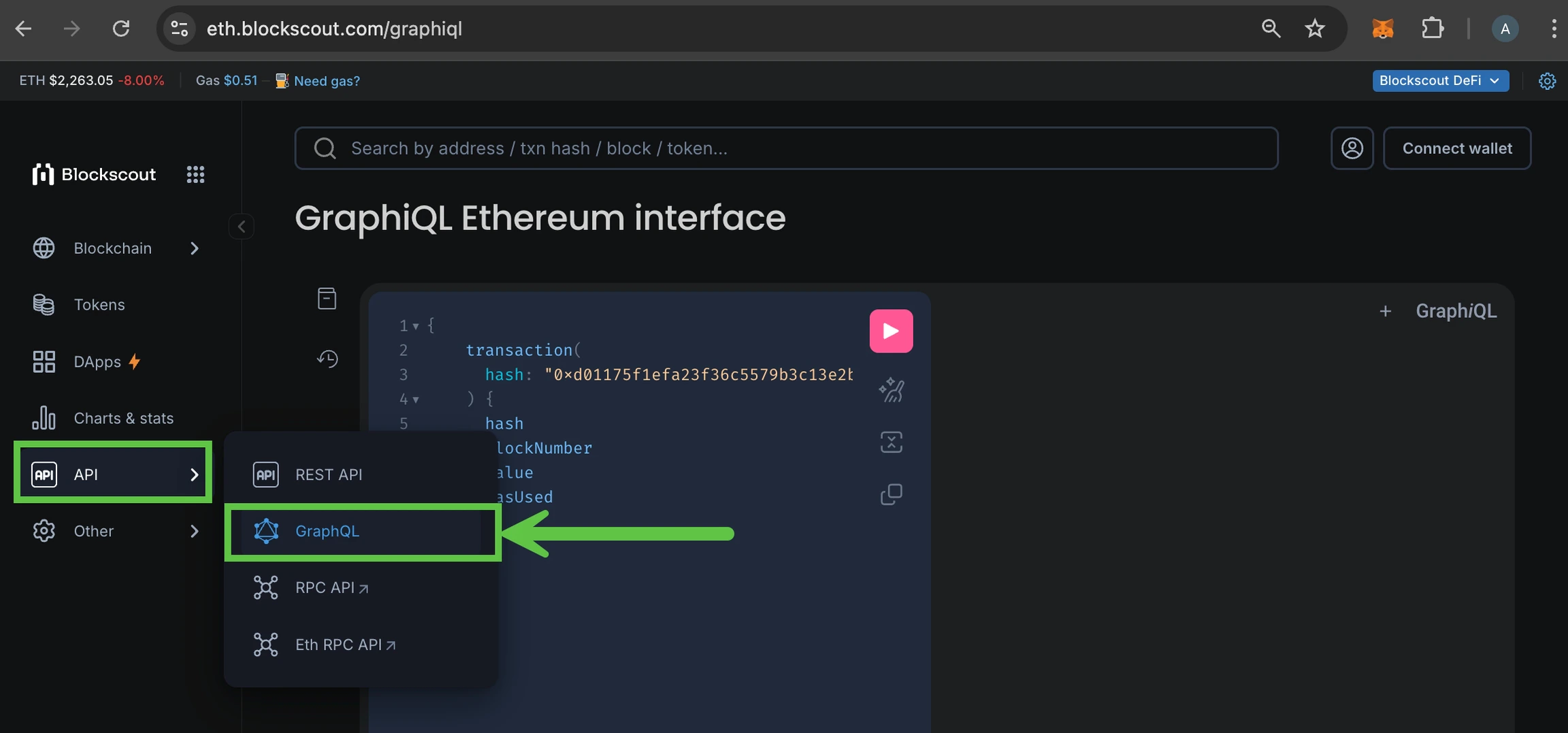 To access Blockscout GraphQL interface you can use GraphiQL - in-browser IDE for exploring GraphQL. It’s built in to Blockscout. From theAPIs dropdown menu choose GraphQL.