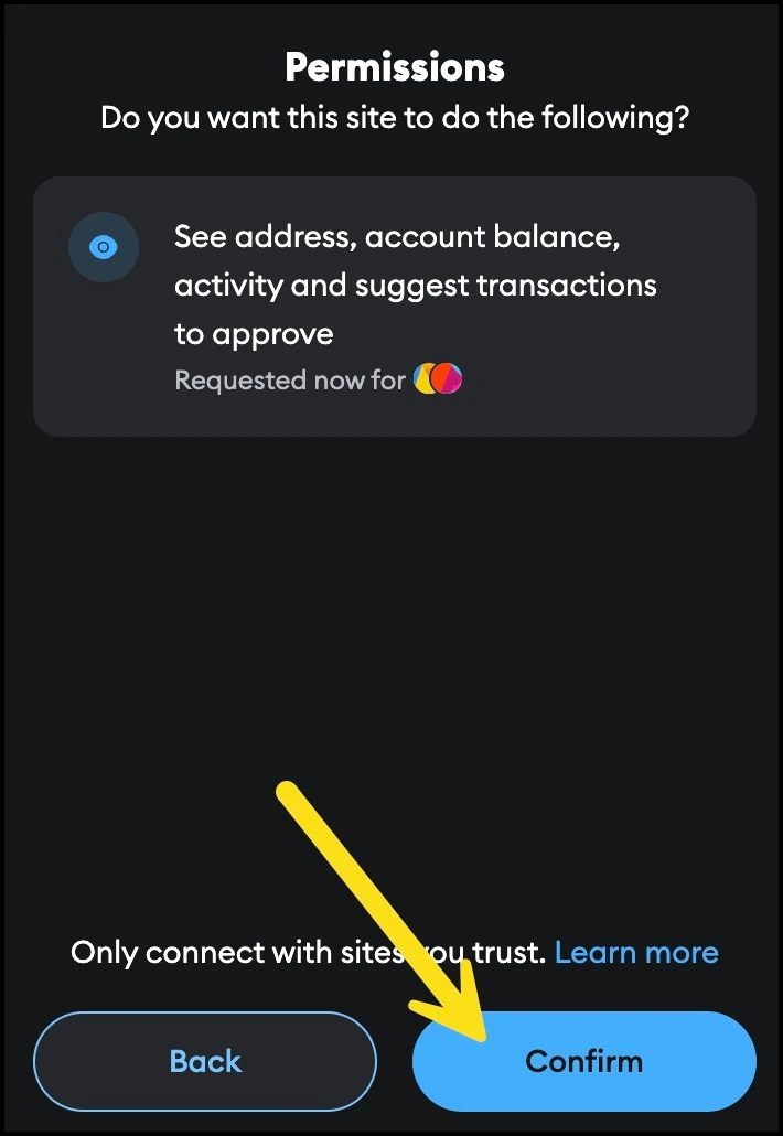 Once you have granted permission to connect your wallet, you can login to your account. When confirming in your web3 wallet be sure to check that the site info and wallet info are correct (in this example we are using a testnet, so the information will be different depending on the instance you are accessing).