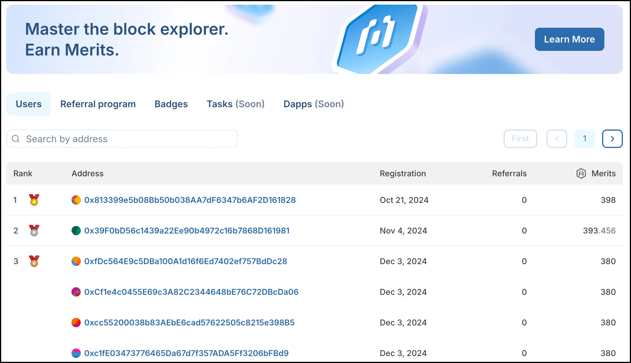 - Ranking is determined by the number of Merits earned. If addresses share the same number of Merits, they all share the same rank. In this example, all accounts have 352 Merits, and are all ranked 12.